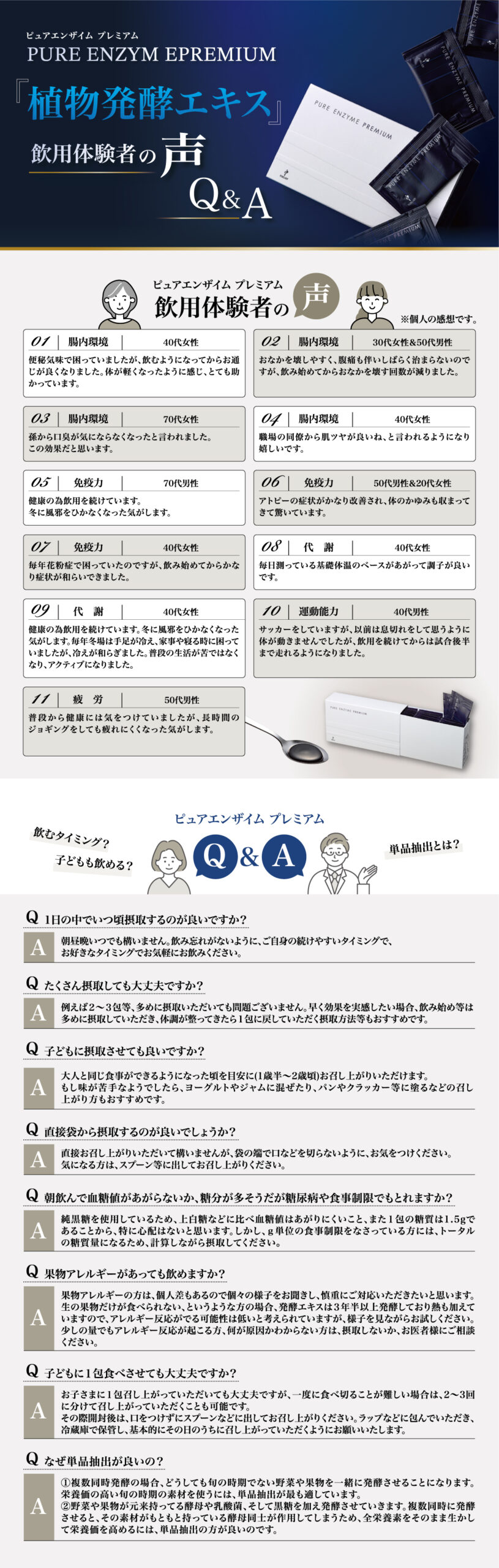 植物発酵エキス(黒砂糖、プルーン、ヨモギ、大豆、オリゴ糖、イチゴ、リンゴ、ブドウ、モモ、ミカン、ユズ、カキ、シソ、カボチャ、レイシ、ダイコン、日本山人参、 ホウレンソウ、ニンジン、ケール、大麦若葉、モロヘイヤ、コンブ、玄米、スイートコーン、キウイフルーツ、キンカン、シイタケ、米ぬか、トマト、レモン、ココア、キクラゲ、ワカメ、ヒバマタ、根コンブ、ブルーベリー、キュウリ、アケビ、ヤマモモ、アカメガシワ、 オオバコ、クマザサ、スギナ、ビワの葉、キャベツ、マイタケ、ヒジキ、ナス、小松菜、セロリ、ナシ、ピーマン、ゴーヤ、チンゲンサイ、ウメ、レンコン、ウコン、イヨカン、ビタミン菜、イチジク、ヤマブドウ、ゴボウ、ブロッコリー、ショウガ、カリン、パセリ、アスパラガス、セリ、キイチゴ、ミツバ、ミョウガ、グミ、ブラックベリー、冬イチゴ)(国内製造)、イソマルトオリゴ糖シロップ、水溶性食物繊維、黒高麗人参エキス未、発酵紅参エキス末/シクロデキストリン、(一部に大豆·りんご・もも・キウイフルーツを含む)